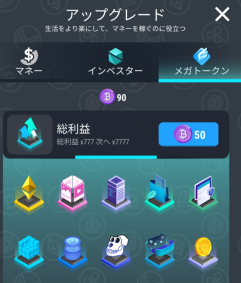 メガトークンに関しては、全施設にメガトークンで7倍にすると17倍になり、10クリプトコイン・30クリプトコイン・50クリプトコイン消費すると、それぞれ77倍・777倍・7777倍と増えていく